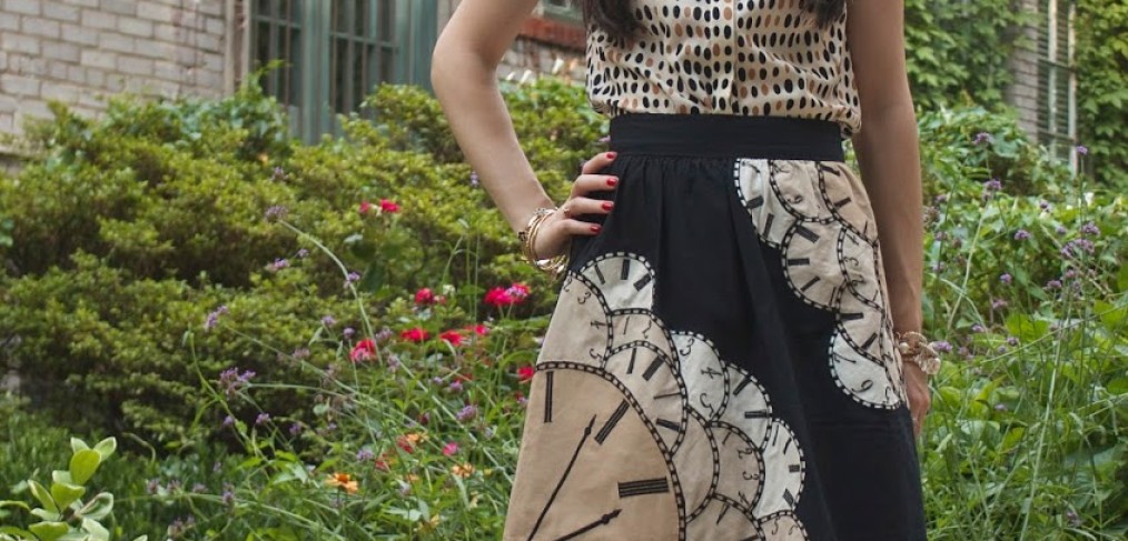 Top: borrowed from Julie Brown Designs // Skirt: Anthropologie (Similar clock print styles: Modcloth, Modcloth) // Heels: Zara // Bracelets: Forever 21, Target, c/o Neon Amber Jewels